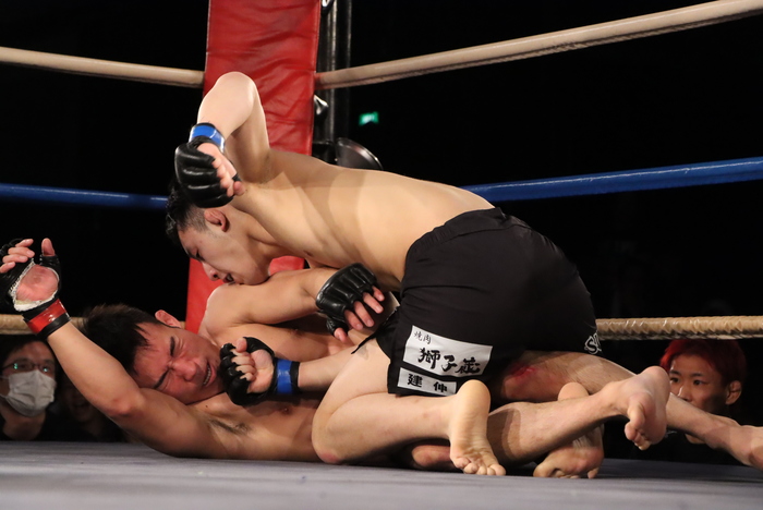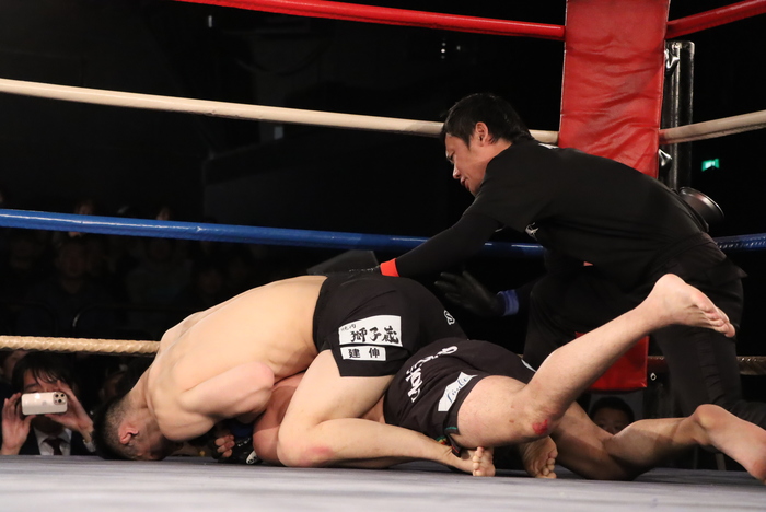 2R、右を当てた藤田がダブルレッグでテイクダウン。腰抱き左でパウンド。ハーフからスタミナ苦しい人見に背中を着かせてパウンド、背中を向けた人見にリアネイキドチョークを極めた。
