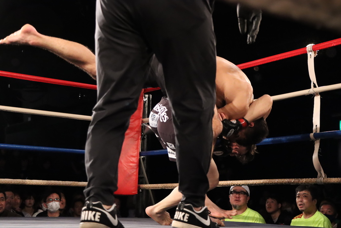 1R、ともにオーソドックス構え。圧力かけるデイネッシュに安海は前蹴り、ロー。右を振るデイネッシュに安海はダブルレッグを混ぜて組んで払い腰テイクダウン。Vクロスを狙うがインバーテッドになって足かけ立つデイネッシュ。