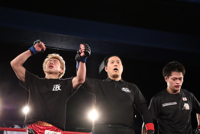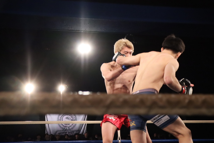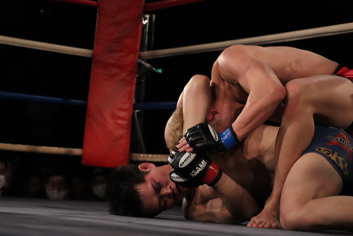 試合は、先手の武田の左右の蹴りから左差しで押し込み。コーナー背にヒザ突く御前は左を返す。2Rに首投げテイクダウンも、首抜きかける武田がトップ奪いマウントから鉄槌。判定3-0(20-18×3)で勝利した。