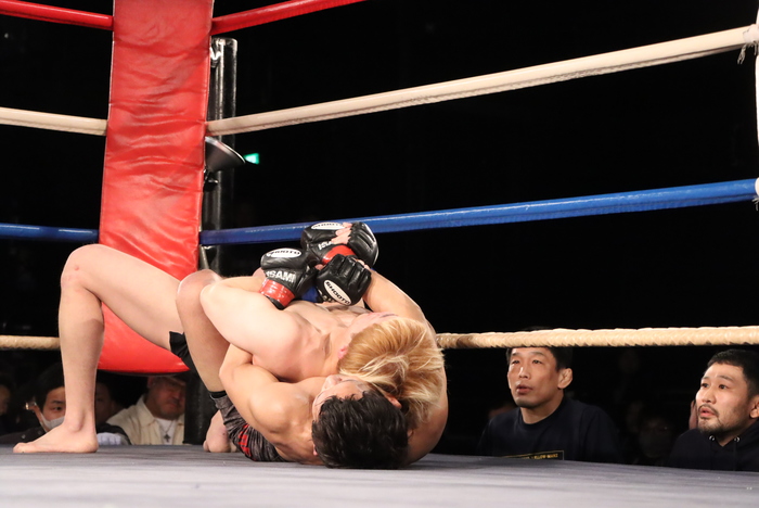 2R、左オーバーハンド、バックブローの志賀に蓮池は前蹴り。ダブルレッグでコーナーに押し込みテイクダウンの志賀。バック奪い両足フック。背後からパンチの志賀。リアネイキドチョークを狙うもゴング。