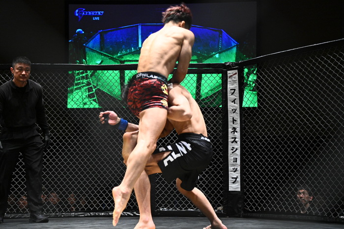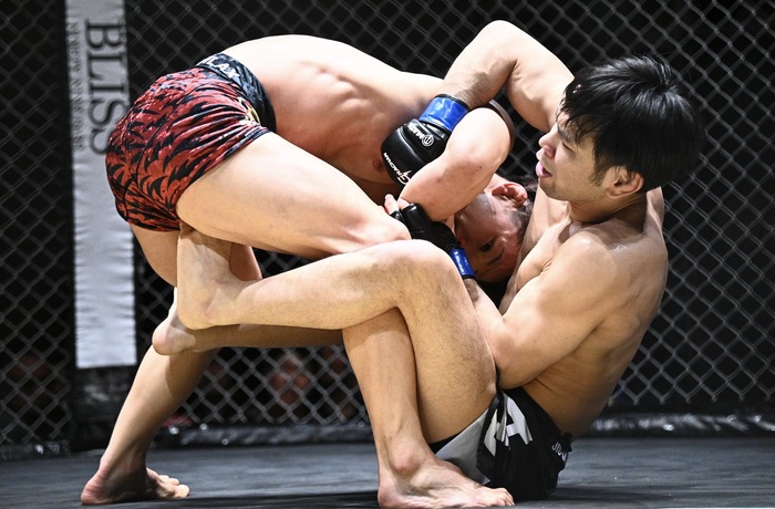 1R、渋谷の跳びヒザに引き込む江崎はラバーガードから右の鉄槌を頭に叩く。フットチョークの足を外した渋谷はハーフから右で差して抑え込み。フルガードにする江崎。渋谷は左足でまたごうとするが、江崎はオモプラッタ、足関節狙いから立ち上がり、トップを奪い、ケージに座った渋谷にギロチンチョーク。仰向けになって防ぐ渋谷にマウントを奪い、センタク挟みから鉄槌連打! 江崎のラウンドに。