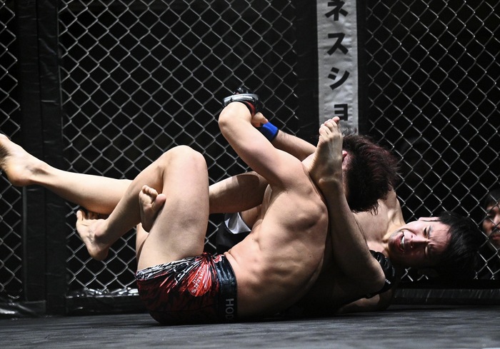 2R、中央に出た渋谷にダブルレッグから引き込んだ江崎。右で差す渋谷に三角絞め狙いからキムラクラッチ、そこからともに足関節狙いで外してトップは渋谷。