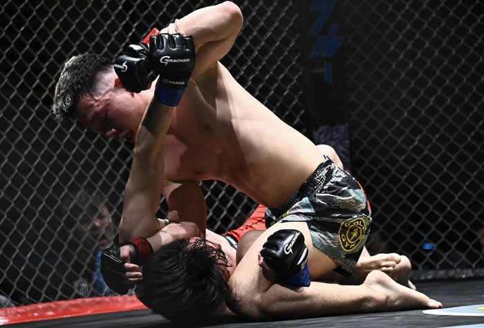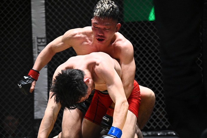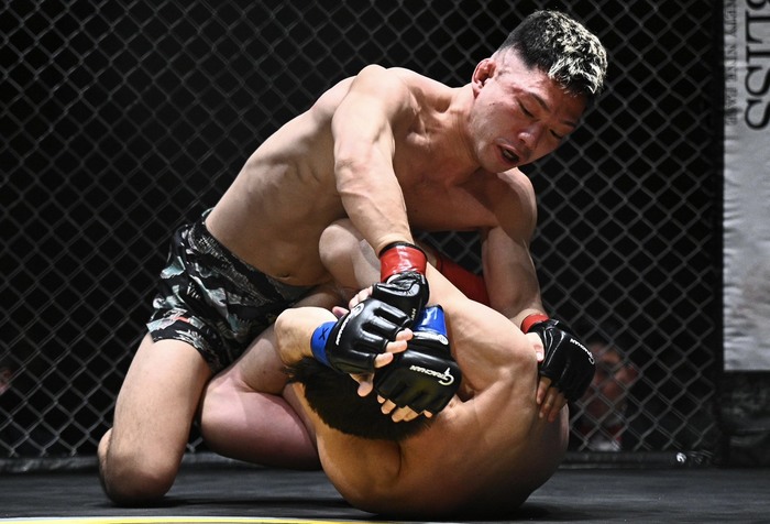 中腰から前転足関節狙いの長谷川に両者立ち上がり。内股で投げた野澤が鉄槌。バタフライガードの長谷川にパウンド。長谷川も下から殴る。