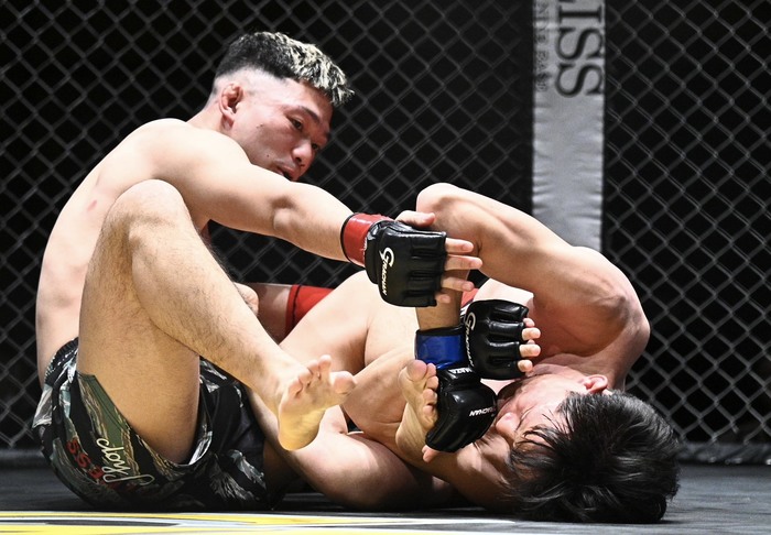 2R、右突く野澤は長谷川に引き込み足関節狙いに上四方。足をからませる長谷川にハーフから鉄槌。下の長谷川のレッスルアップにギロチンチョークを合わせる野澤。がぶりから寝かせて上四方に。サイドになると下からネルソンの長谷川はめくるが前転してトップのままの野澤はパウンド。打ってこいと顔を指す長谷川に、野澤はパスサイドバックでパウンドも、長谷川は徹底して寝技。