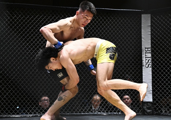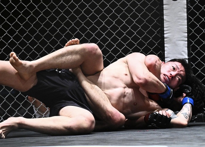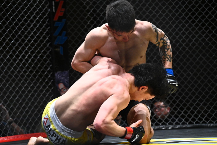 1R、先に佐藤が組んでテイクダウン。倉水はブリッジを狙うが、押さえつけてハーフの佐藤は左枕からパスしてマウント。倉水はブリッジで足一本戻すとハーフで押さえ込む佐藤。左で差して立とうとする倉水を潰してマウントに。