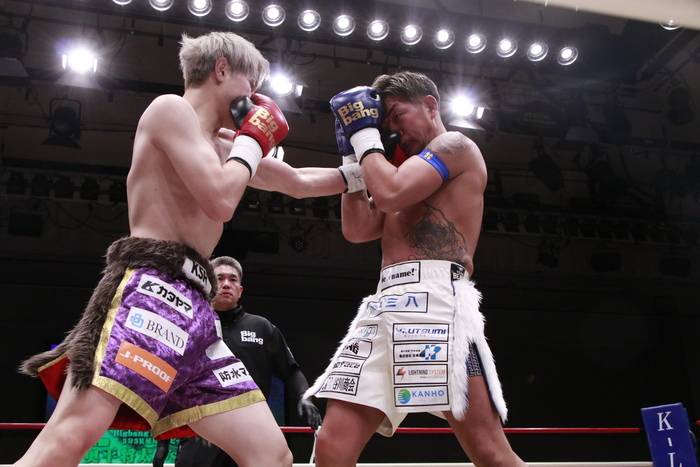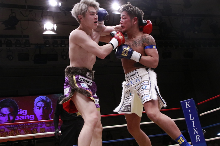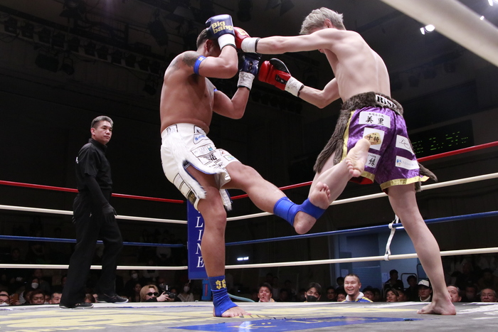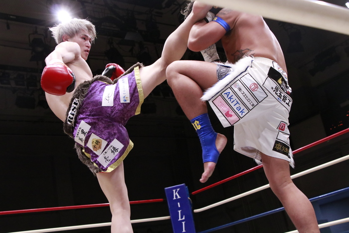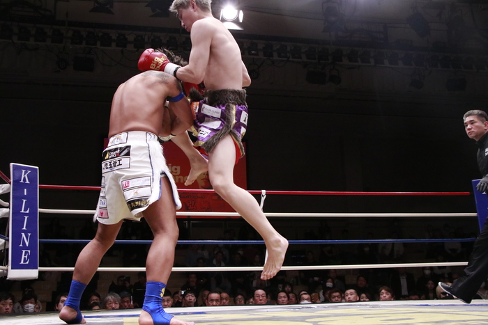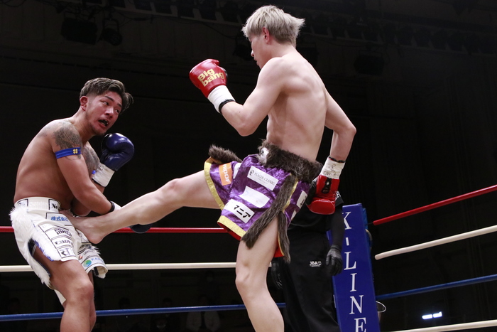 1R、距離を詰めて右カーフを蹴って来るサウスポーの弘輝に奥平はヒザを連発。至近距離の飛びヒザも繰り出す。さらに右三日月を突き刺す。序盤はこのヒザをもらい続けた弘輝だが、終盤にノーモーションの左ストレートを当て始める。