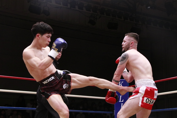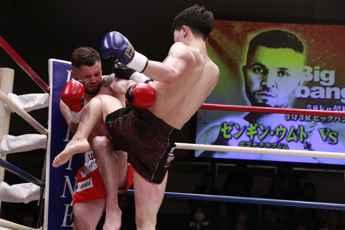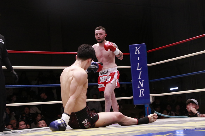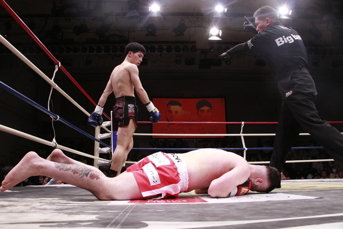 3R、小江は徹底した左ミドル、前蹴り、ヒザでボディを攻め、前へ出る。ウムトはヒザを突き刺されると嫌がる顔を見せ、小江がヒザで畳み込むとダウン。レフェリーが様子を見てストップした。
