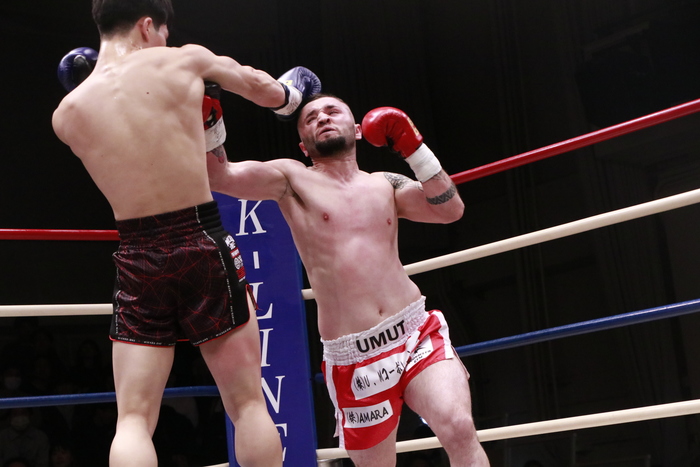 2R、小江が前蹴りでボディを攻め優勢の場面で、思い切り左右フックを振っていたウムトの右フックがヒット。小江が尻もちをつき、ダウンがコールされる。両手を広げてダウンじゃないとアピールした小江。