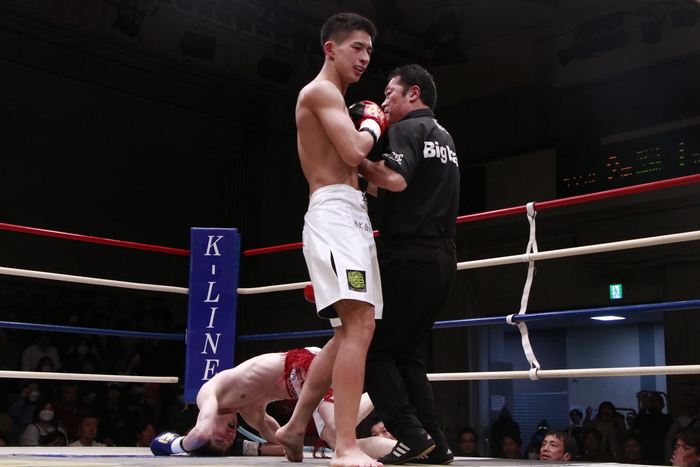 2R、ジャブを中心にパワフルなパンチで攻める大江は、セコンドの指示通りワンツー・スリーまでつなげるパンチでラッシュ。左フック、右ストレートで追い込んでいき、ロープを背負った堤に右ストレート一閃。堤がダウンし、セコンドからタオルが投入された。