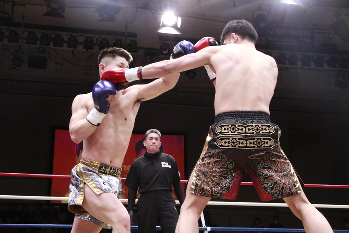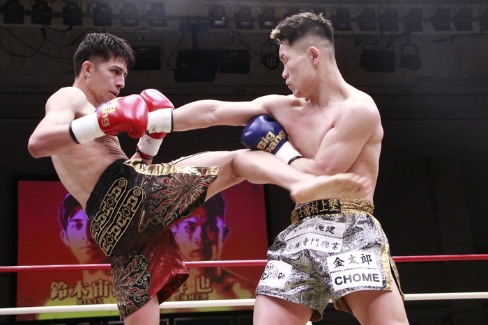 1R、まずはローの蹴り合い。昇也が左フックをヒットさせると、鈴木は右ストレートで逆襲。至近距離からのヒザも突き上げる。
