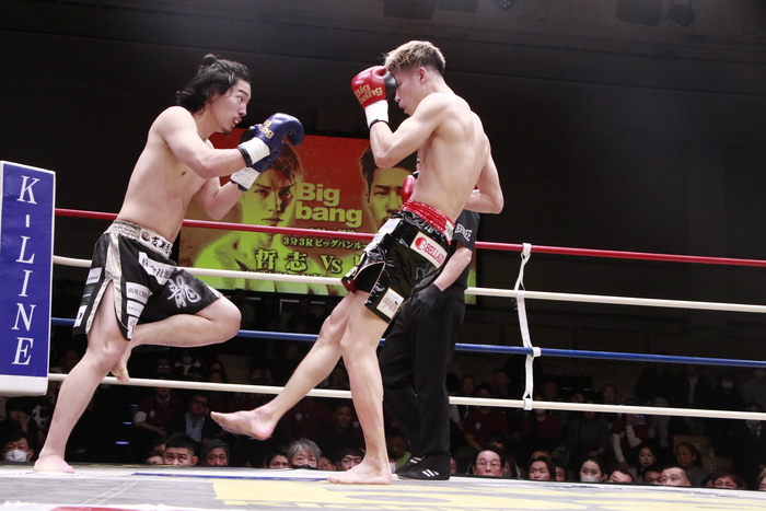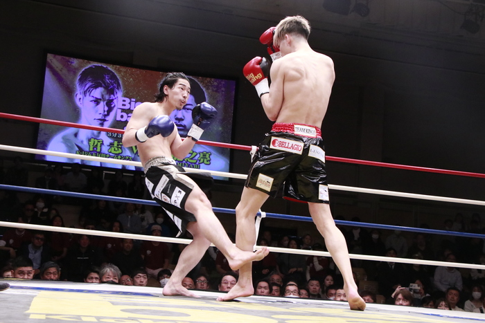 2R、関は右カーフから右アッパー、左フックのコンビネーションを繰り出して前へ出る。哲志はジャブで応戦しての右カーフ。この右カーフが効き、哲志がダウンを奪う。