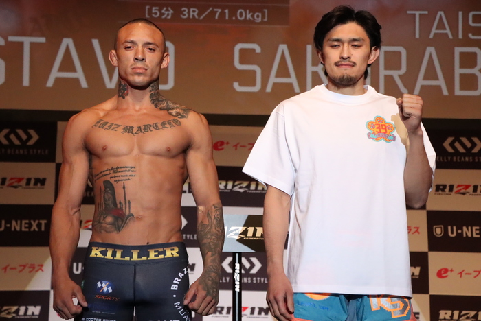 第11試合のRIZINライト級(-71.0kg)5分3Rで対戦する、ルイス・グスタボ(ブラジル/EVOLUCAO THAI)は70.8kg、桜庭大世(サクラバファミリア)は70.5kgで計量パス。