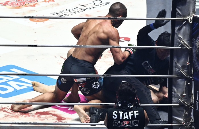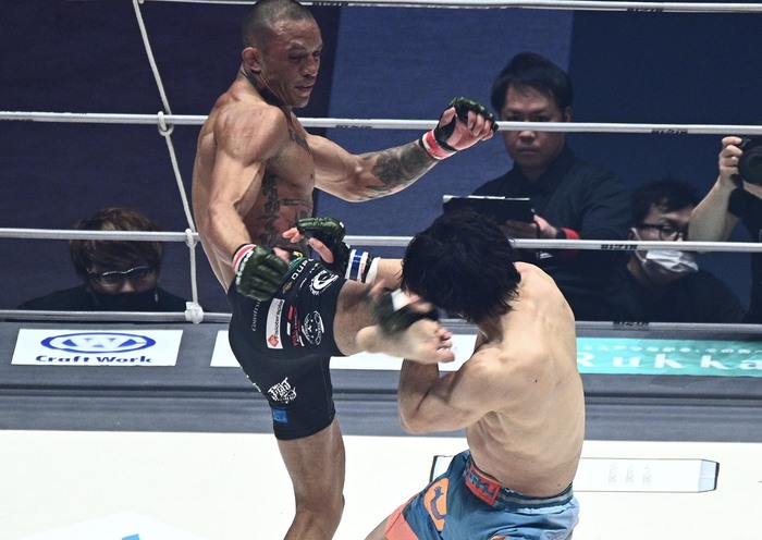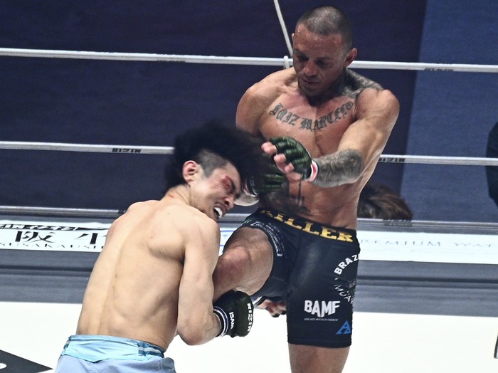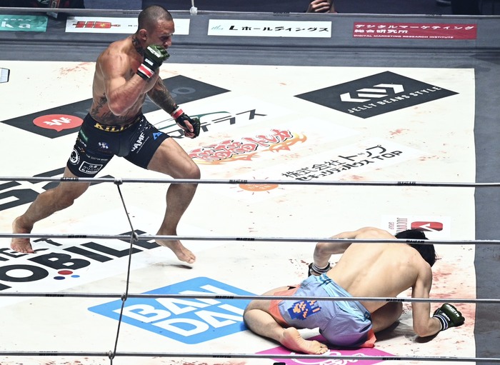 大きな右オーバーハンドを振るグスタボ。かわした桜庭は左を打ち込むが、グスタボも右を返すと、右ハイ。ブロッキングした桜庭。グスタボは同じ挙動で今度はシャープに右をパンチで打ち込むと、もらった桜庭がダウン! パウンドにレフェリーが間に入った。