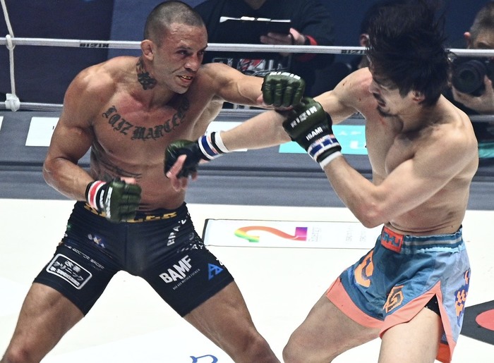 桜庭の蹴りに左フックのグスタボ。桜庭は左の蹴りを上下に打ち分ける。グスタボの入りに左テンカオも打つ桜庭は、レベルチェンジも。右オーバーハンドを潜る桜庭はシングルレッグも切るグスタボ。