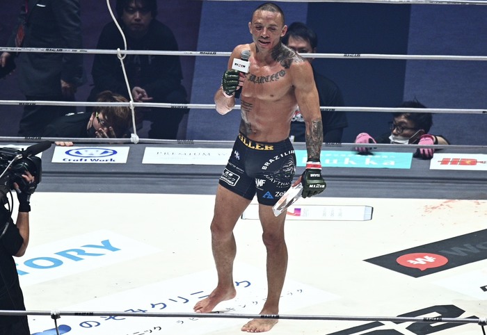 グスタボはマイクを持つと「こんばんは、元気? またここに来れてとても幸せです。特別な場所に来れて幸せです。RIZINの雰囲気が大好きだし、ファンがくれるエネルギーが恋しかったです。絶対にKOすると言ってKOするところを見せました。またタイトルに挑戦したいです」と、タイトル再挑戦を誓った。