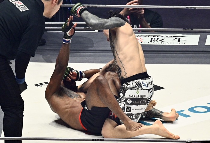 強振するモタに伊藤は回転。伊藤は左ハイをヒットさせると、“効いてない”と咆哮したモタだが、伊藤はすぐにワンツーの左ストレート! モタが後方に倒れて伊藤がパウンド連打、レフェリーが間に入った。