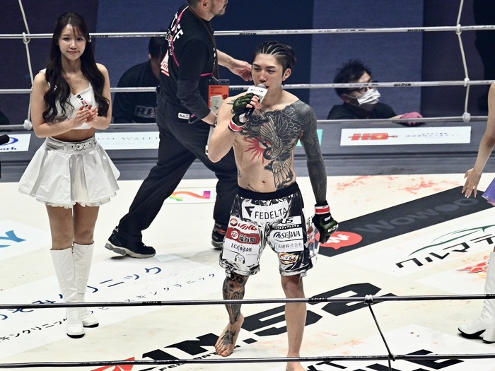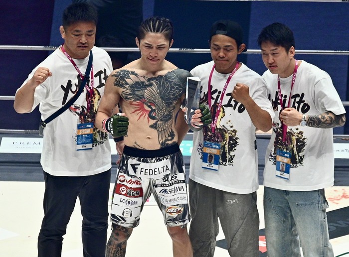 伊藤は「有明の皆さん、盛り上がってますか。これがRIZINフライ級の伊藤裕樹です。開幕戦一発目からどうですか、盛り上がったんじゃないでしょうか。RIZINがvs.世界って言ってるんですけど、どんどん強いヤツをRIZINに呼んできてもらって、2026年の大晦日は名古屋なので日本人最強の、どこ行ったあの運転の下手な人。あなたを超えるためにこの1年突っ走るのでよろしくお願いします。言い忘れた、征矢、何やってるんだよバカ野郎。まあいいや、俺がフライ級獲るので」と、ハイテンションでアピールした。