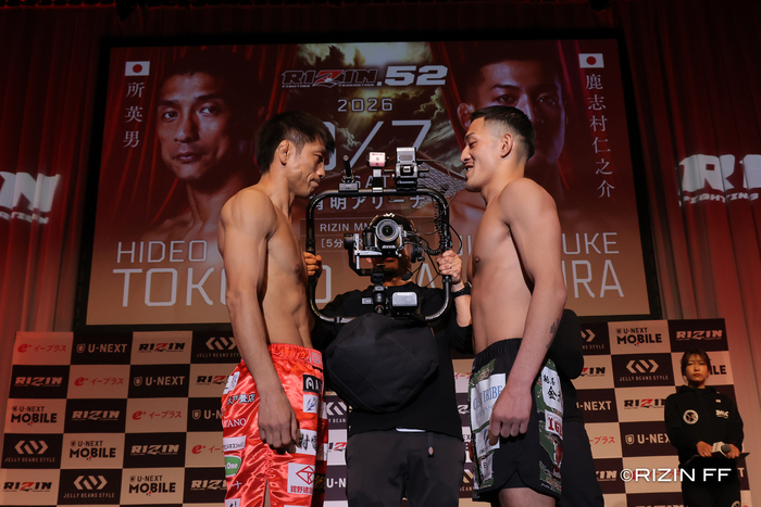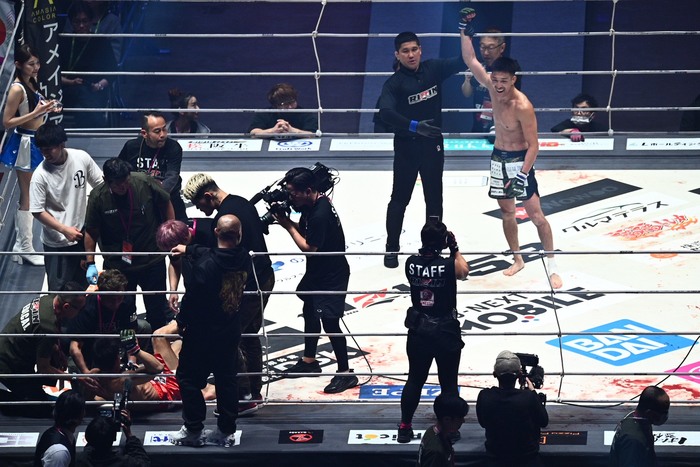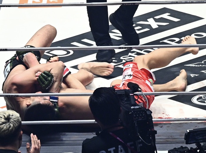 勝利に歓喜した鹿志村は「有明の皆さん、調子どうですか。もっともっと調子どうですか。よし、とりあえずひと段落。戦っていただいたスーパーレジェンド所英男選手、ありがとうございました。この場を借りて所英男を超えられたこと、とても光栄に思います。vs.世界でRIZIN動いていると思いますが、僕も参加させてください。誰とでも戦うし、誰とででも組めるし、俺が戦えば一本とれるんじゃないかなとみんなワクワクすると思うので。世界一の団体RIZINをこれからもよろしく」と、vs.世界に自分も加わりたいとアピールした。
