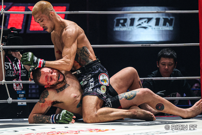 サイドから細かいパウンドから抑え込むのではなく、体を放してRIZINならではの左右ヒザ! 大きくカットしたスウィーニー。マウントを奪う佐藤はパウンド! ヒジ! 右まぶたカットのスウィーニーの出血が多くなる。