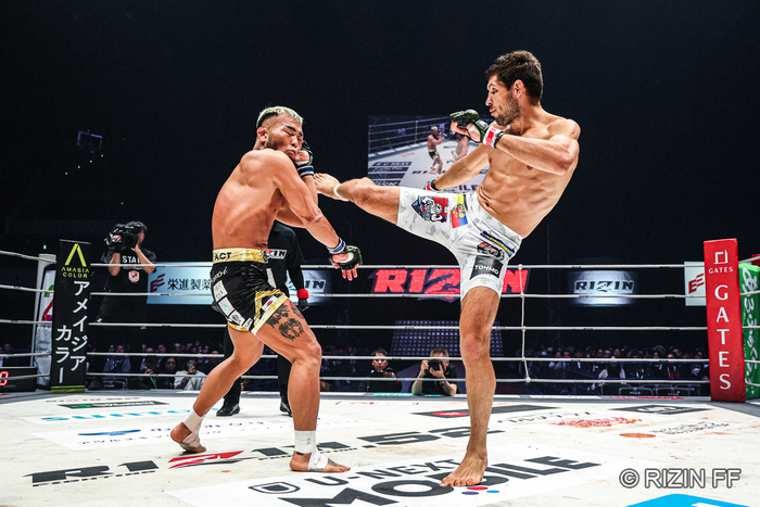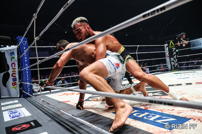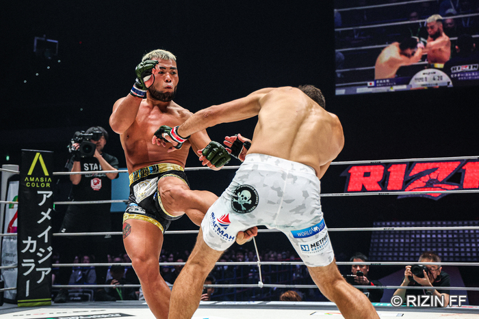 「そこは長南さんといろいろお話をして、蹴ってくるタイミング、蹴り終わり、そういうところで下がると来るので、蹴り終わりのタイミングで前に出るっていうことも指摘をしてもらっていたので、そこでプラスアルファMMAの上下のフェイントをかけることができたので、そこで少しはプレッシャーをかけることができたのかなって。