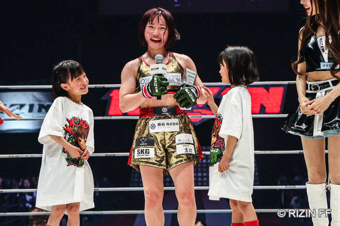 「本当ですか? こんな試合展開になってしまったんですけど、私のことが嫌いでもRIZIN女子格は嫌いにならないでください!(フライングゲットのポーズ)」