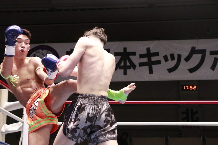 長いリーチからダイナミックなパンチを繰り出すカサドに、希祈は下がりながらも右ストレート、左フックを返す。左ミドルもしっかり当てる希祈。
