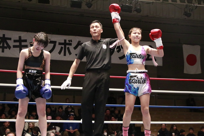 両者ともワンツー・ロー。手数と勢いに優る西田が、2Rは左右ミドルも織り交ぜて勢いよく前に出ての判定勝ち。