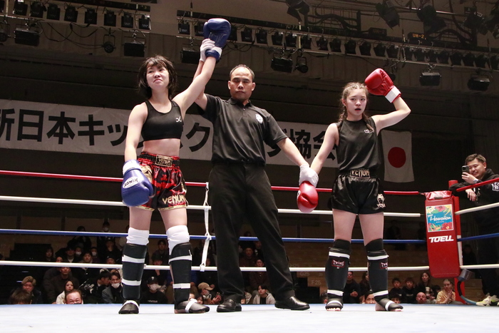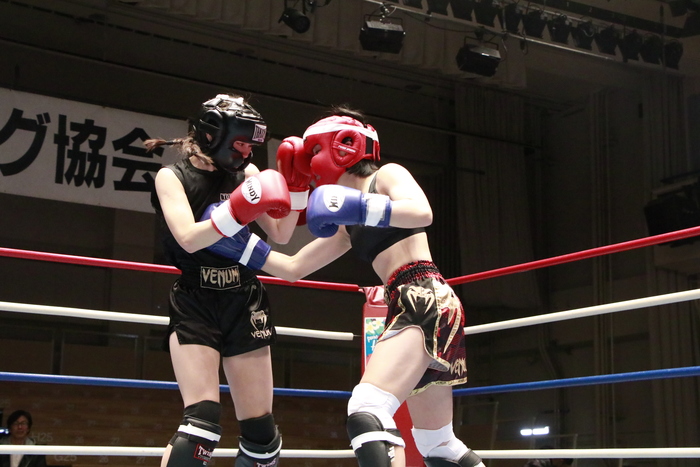 15歳女子同士の対戦。首相撲からのヒザに持ち込む尾方に対し、宮永は右ストレートと左ボディ。2Rは宮永が強い左ミドルと右ストレートを当て、判定2-1で宮永の勝利となった。