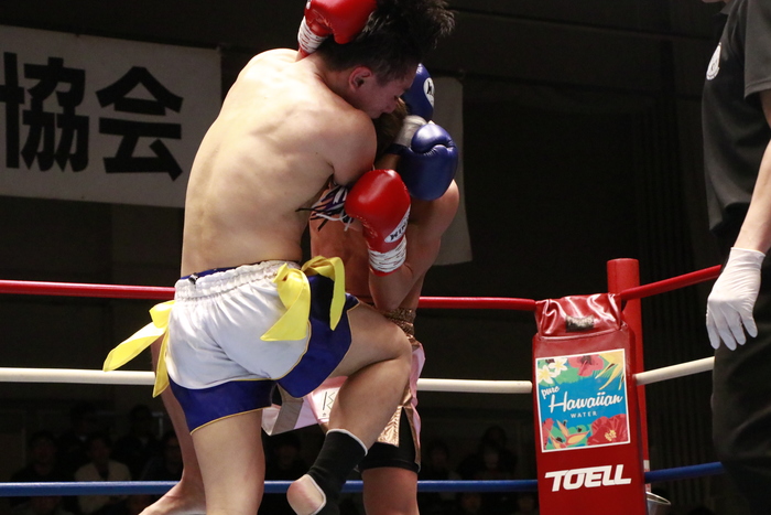 2R、ロープを背にする中島は大岩が前に来るとテンカオ、組んでのヒザ蹴り。大岩はパンチを狙うが、大岩は付き合わず蹴っていく。