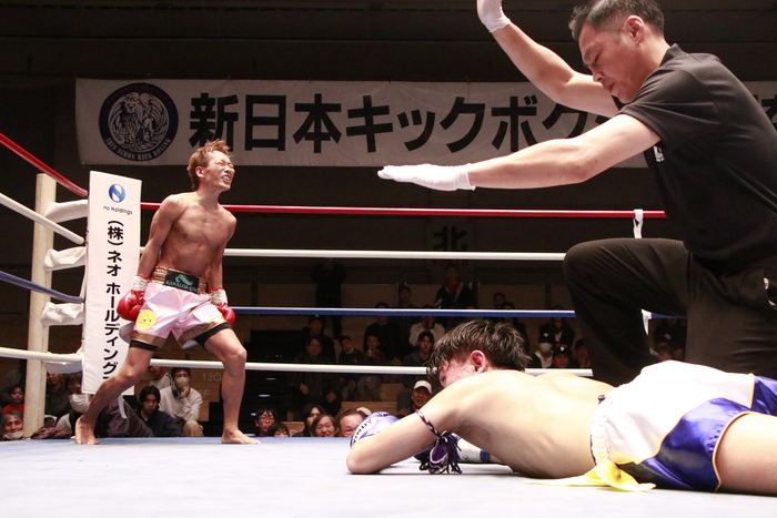4Rも中島がワンツーからの組みヒザに持ち込む。大岩もワンツーを打ちに行くが首相撲に捕まる。中島のムエタイスタイルで試合は進んでいったが、組み際に大岩が虚を突くバックハンドブロー! この一発が決まって中島は前に倒れ、立ち上がることが出来ず大岩のKO勝ちとなった。