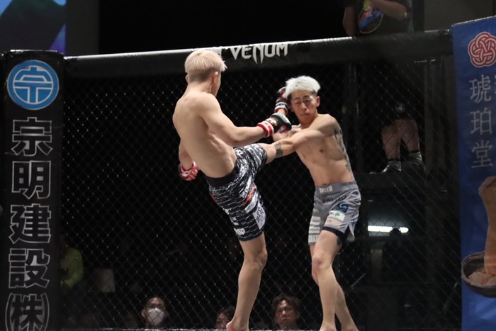 1R、サウスポー構えの知名に、オーソの武蔵が右ミドを当て、前蹴りでけん制。詰める知名が左ハイ、ガードするも下がりサークリングする武蔵を追って左ミドルを蹴る。