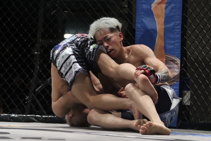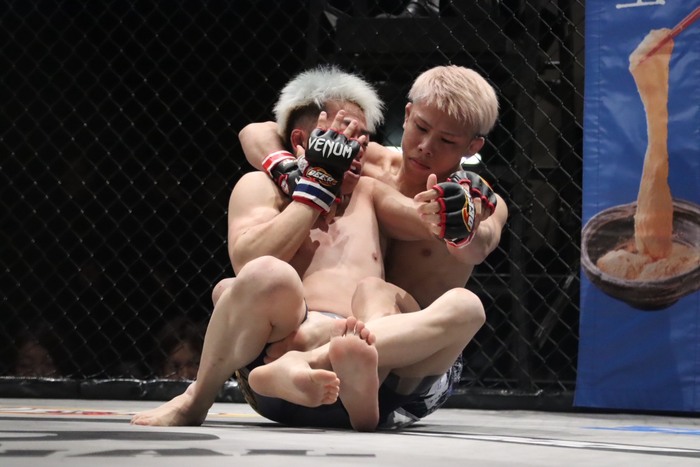 そこから三角十字に移行。下から腕を左脇に挟んで右のエルボーを頭に突く知名は鉄槌も。上体を張ろうとする武蔵の右腕を流して足を引き寄せタップを奪った。