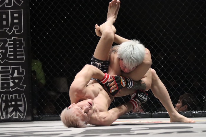 ブリッジして亀になった武蔵のバックに回った知名がパウンドしながら両足をフック。正対狙う武蔵にツイスターを狙うが、足を解いたところで武蔵が仰向けに。しかしトップは知名。