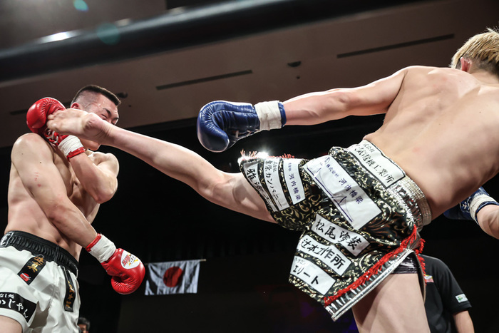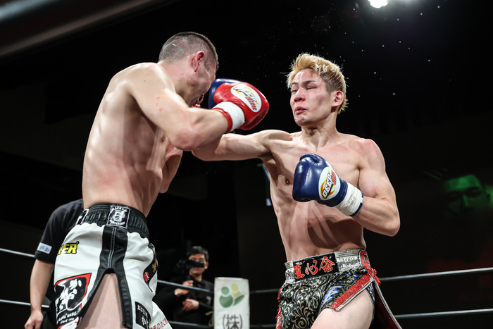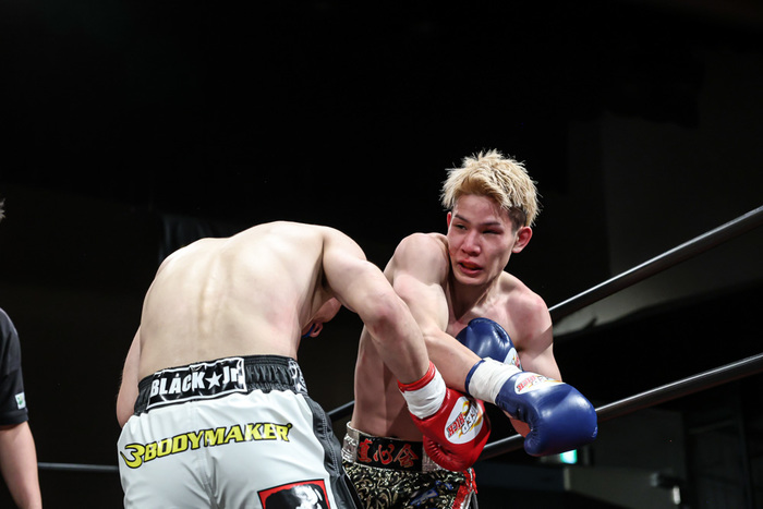 1R、健真が攻勢に出る。ミドルキックで相手のボディを効かそうとする上野だったが、王者はワンツーやローキックでリズムを掴みかける。続く2R開始早々、勝負をかけた両者はいきなり打ち合いに挑む。そうした中、上野は左フックで健真をグラつかせ先制のダウンを奪う。その後健真は度重なるバッティングによりレッドカード(減点1)をもらってしまう。