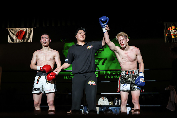 4度目の正直で涙、涙の戴冠劇――。王者・健真(BLACK☆Jr)に挑戦者・上野コウキ(直心会)が挑んだDEEP☆KICK-60㎏タイトルマッチは2Rに左フックでダウンを奪った上野がそのポイントを死守する形で3-0の判定勝ち。第11代DEEP☆KICK-60㎏王者となった。