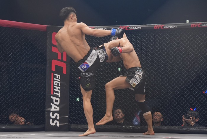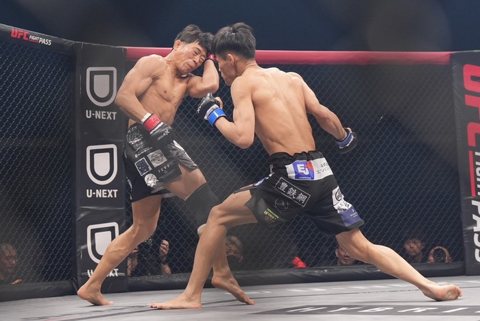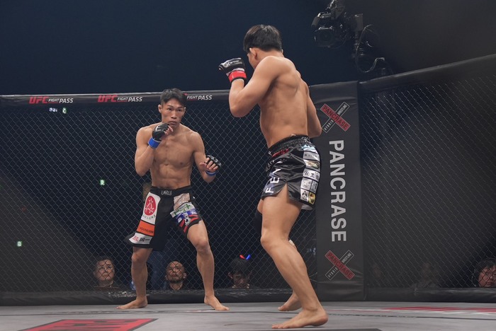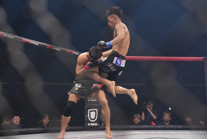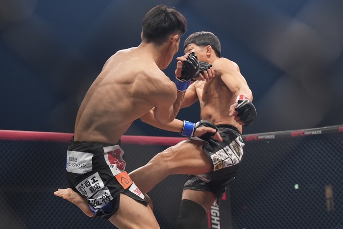 1R、サウスポーの岡田にオーソドックスの清水。右ボディから左フックを入れた清水。ケージに詰めてヒザを出した清水に四つに組んだ岡田。両者クラッチしてがっぶり四つになると、内股を狙う岡田。こらえてケージに押し込む清水。岡田は放さず首投げ。投げたが下になる岡田。しかしすぐに三角絞めに捕らえた。