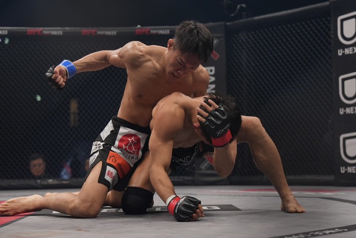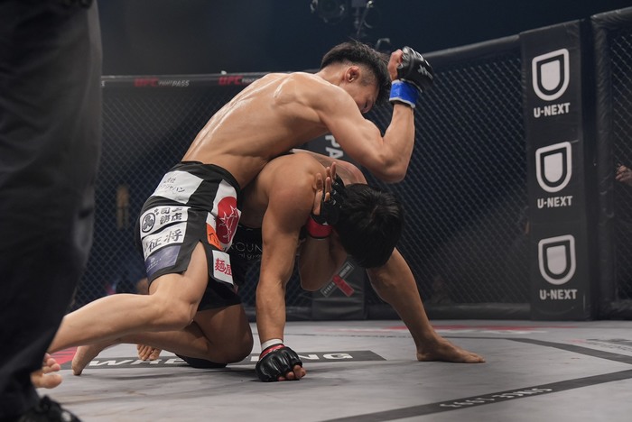 清水の右ハイをキャッチした岡田。そのままテイクダウン。ケージ際で体を起こそうとする清水の体をまたいでマウントを取った岡田だが、清水が起き上がって上を取りパウンドを落とす。立って離れた清水。岡田はまた組んで投げを狙ったが、潰されて下に。
