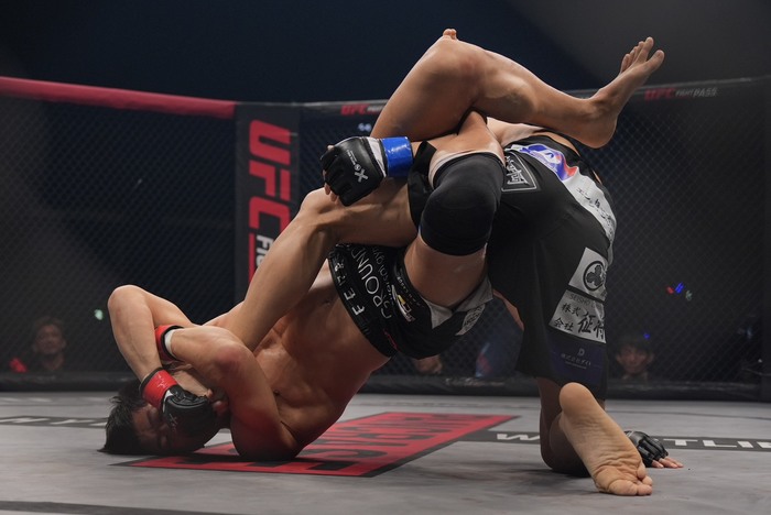 岡田はタックルに入るが、清水がこらえると引き込んでガードを取る。ガードからフロントチョークに抱えた岡田だが外れた。残り10秒で体を起こしてパウンドを入れる清水。岡田は足で阻んでディフェンス。2R終了。