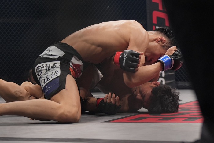2R、右ハイをヒットさせた清水。キャッチした岡田が組みついたが、逆に清水がボディロックに捕らえてケージに押し込む。清水がサバ折りでテイクダウン。1Rに三角で絞め続けた岡田に消耗が見える。サイドで押さえ込む清水。