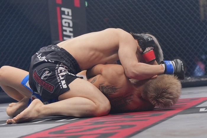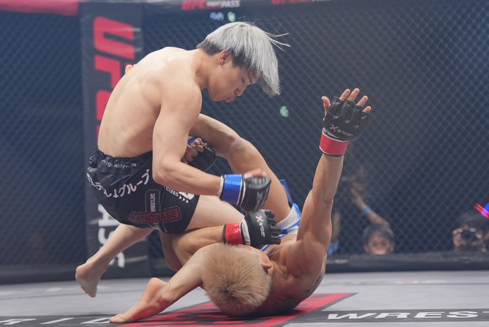 3R、パンチで出た佐々木だが、リトルもパンチを打ち返す。お互いの左が顔面にヒット。タックルに入る佐々木。シングルレッグでテイクダウン。ハーフで押さえ込む。
