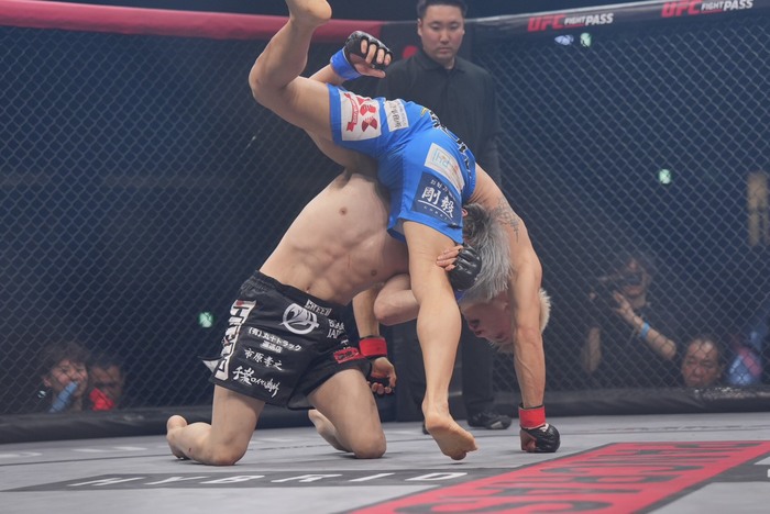 離れ際にリトルがヒザを入れる。パンチで出たリトルに、まっすぐ下がった佐々木。タックルに入りテイクダウンを奪うも、押さえ込めず立たれた。タックルに入る佐々木だが、リトルは切ってバックに回りパウンドを打ち込む。