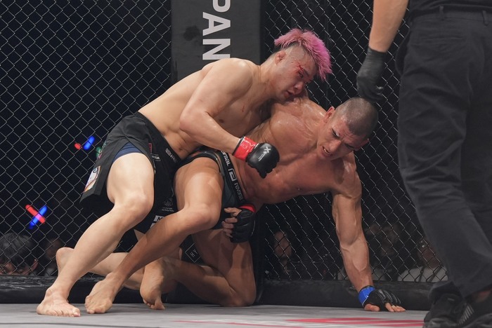 お互い消耗している。レーベンのパンチ3連打が顔面にヒット。レーベンが出るタイミングでタックルへ。切ったレーベン。がぶりから抜けた内藤がバックに回るが、逆に前に落ちた。