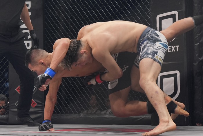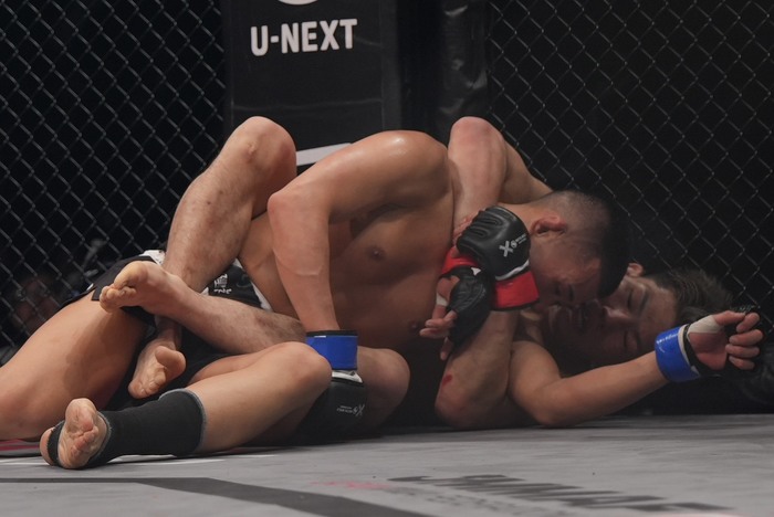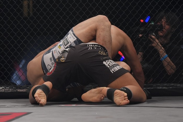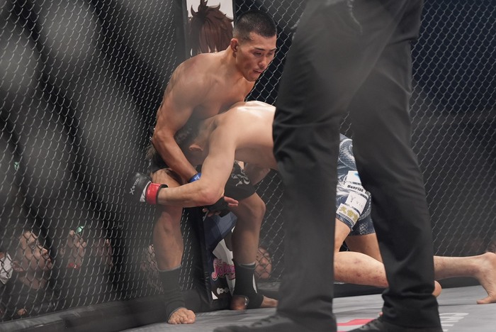 2R、詰めた葛西が右を顔面にヒット。シングルレッグに入った神谷。葛西が四つから倒して上を取ったが、バックからチョークを狙ったところで前に落とされる。バックを取った神谷。バッククリンチからテイクダウンを狙う。正対した葛西。離れた。