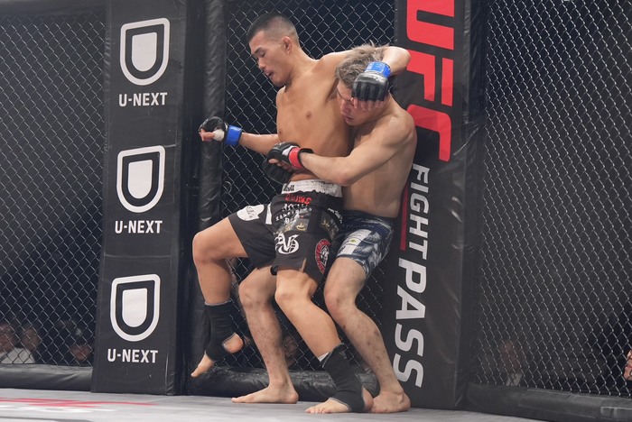 間合いを詰める葛西。神谷がケージを背負ったところでパンチを打ち込む。神谷が飛びヒザを出すが、受け止めて四つに組んだ葛西がケージに押し込む。