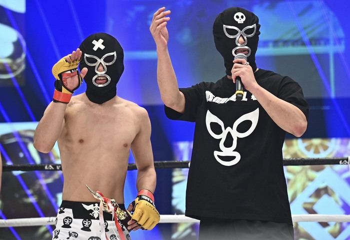 すかさずマスクを着用した戦闘員はマイクを向けられると「イーッ!」。するともう一人のマスクを被った男が「1号は喋りが苦手なので、戦闘員2号です」と通訳を買って出て、戦闘員1号の「イーッ!」を聞くと「今回余裕でした。どうですか、KNOCK OUTの皆さん、僕一番面白いでしょう」と通訳。