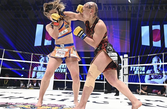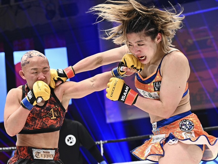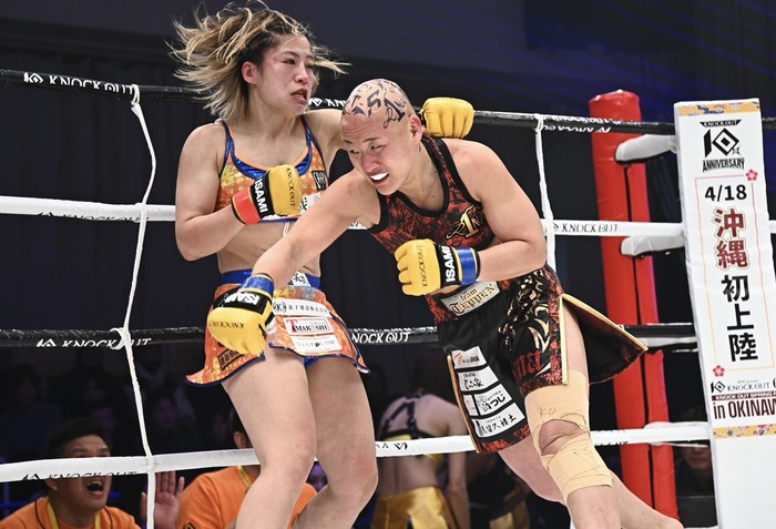 鈴木は翻弄される形となったが、首相撲で組み付いてヒザ蹴りを見舞う。思い切り右フックを振った鈴木だが空振り、逆にRINAが左右フックの連打で鈴木にロープを背負わせた。
