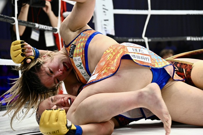 離したRINAは左右フック、鈴木も至近距離で打ち合う。打ち合いに行く鈴木だが、右フックを当てるのはRINA。鈴木は左ミドルからワンツー、右ストレートからの左ミドル。RINAも足を止めて打ち合う。すると鈴木はここで投げを見舞い、パウンドを連打。サイドから抑え込んでのパウンドも連打し、最後に大きな見せ場を作った。
