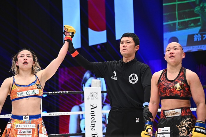 1R開始と同時にRINAが前へ出て右フック、鈴木も右フックで迎え撃ち、横蹴りで突き放す。ワンツーで入って来るRINAに鈴木はジャブ、打ち下ろしの右を狙う。右フックの相打ちから前に出る鈴木。パンチ一辺倒から右ローを蹴る鈴木は、左フックを引っかけるようにしてRINAを転倒させ、サッカーキックに行ったがRINAもすぐに立ち上がる。