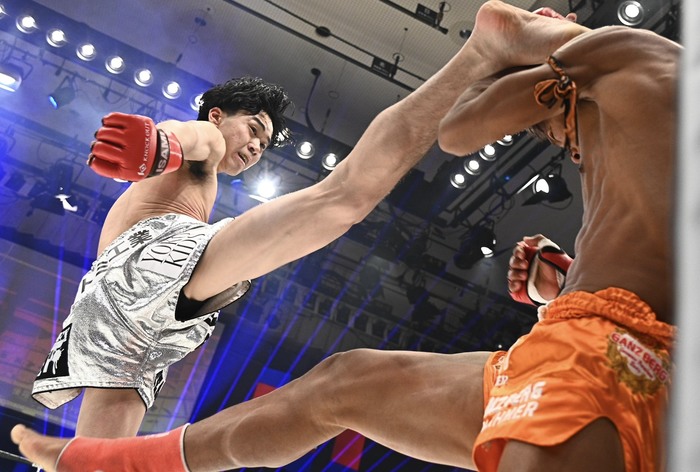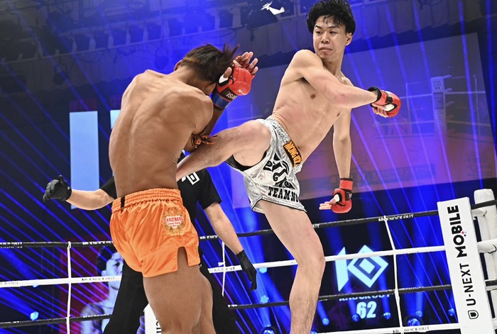 3R、セントリーの左ミドルに右ストレートを合わせに行く優翔。右ローを蹴るセントリーに優翔は奥足への右ローを狙っていく。優翔は縦ヒジを打ってから組むとセントリーを押し倒す。優翔がワンツーで前に出るとセントリーもすぐに前へ出て、優翔の蹴り足をキャッチすると投げ倒す。