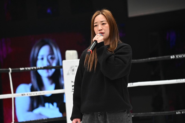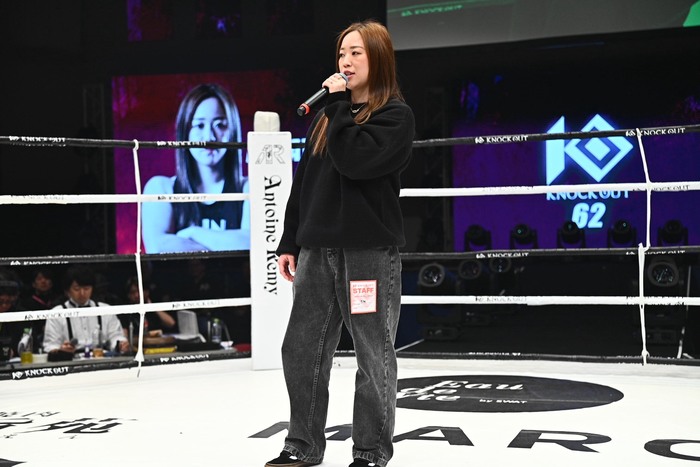 リングに上がった小林は「ここに立つまでに支えてくださった方々ありがとうございます。これからオープンフィンガーグローブムエタイに転向します。そのデビュー戦が出来るってことで、こんな凄い演出だったりKOボーナスがあって、選手がワクワク出来る団体で、そこで試合が出来るのを楽しみにしています。女子の試合ってダウンすらなかったり、誰が見ても面白いって思える試合がほんま少ないって思っていて。そういう人たちに自分の試合を見ろよっていうような試合を見せつけるので、これから期待しとってください」と、KNOCK OUT-REDルールでの参戦を表明。